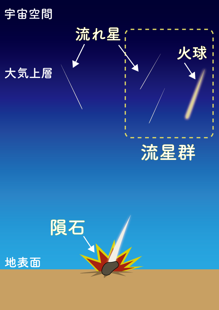 次に「火球」。これは流れ星の中でも特に明るいものを指します。大きなかけらが大気に突入すると空を長く照らし、ときには爆発音を伴うこともあります。先日も鹿児島県のあたりで、夜空がまるで昼間のように明るくなるほどの火球が観測され、大きな話題となりました。火球はなかなか見ることができませんが、出会えたときの迫力は流れ星とはまた違う印象を残します。