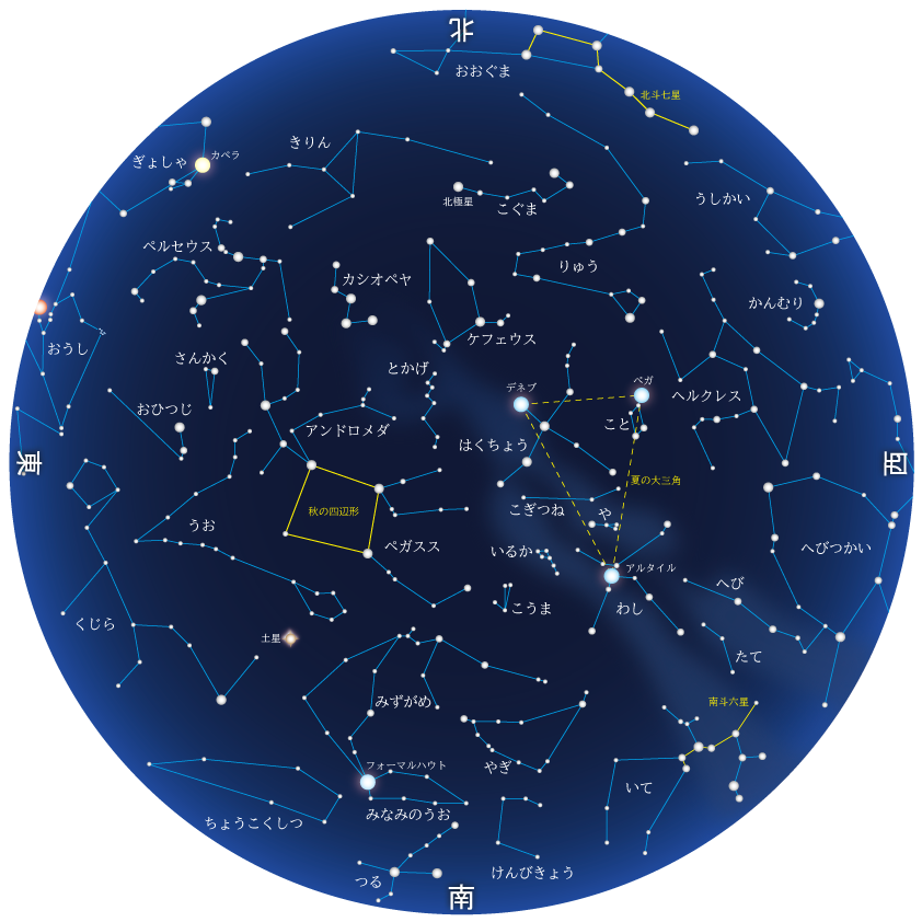 最後に、今月は土星が見ごろを迎えています。その周りにはうお座・みずがめ座・くじら座があります。秋の四辺形の南側を探してみると見つけやすいでしょう。
