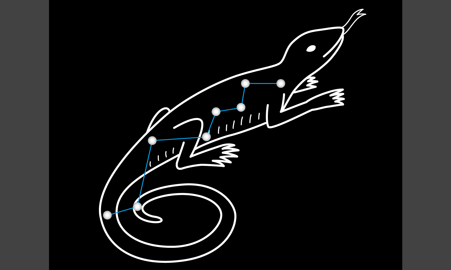 先月紹介をした「こぎつね座」と同じで、「とかげ座」を設定したのも、17世紀ポーランドの天文学者ヨハネス・ヘヴェリウスです。ヘヴェリウス著書の星図に描かれていましたが、この星図には2つの名前が書かれていました。「トカゲ(LACERTA)」と「イモリ(STELLIO)」です。ヘヴェリウスもどちらにするか悩んでいたようで、ヘヴェリウス著書の星図に描かれた姿も、どちらともとれるイメージの絵になっています。