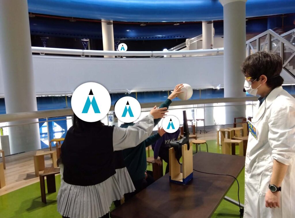 当館の通常の風のサイエンスショーでは、ブロワー(強力な送風機)を使い、発泡スチロール球やビーチボールが浮くかどうかを予想しながら実験を進めます。