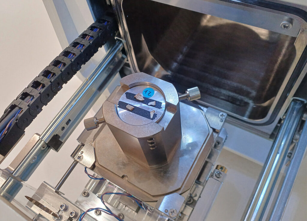 試料台には、生のサツマイモ、加熱したサツマイモ(焼き芋)の切片を載せています。