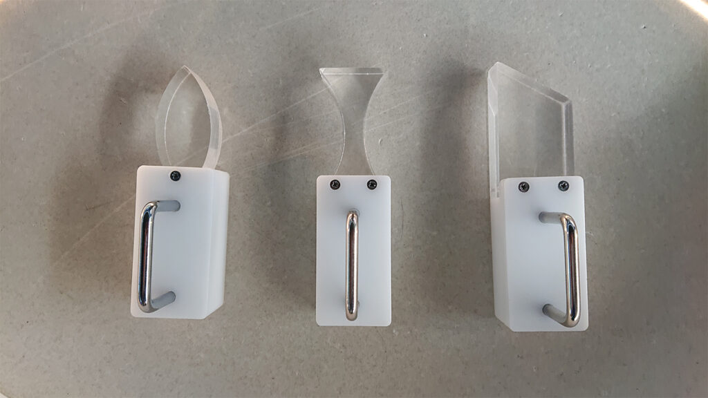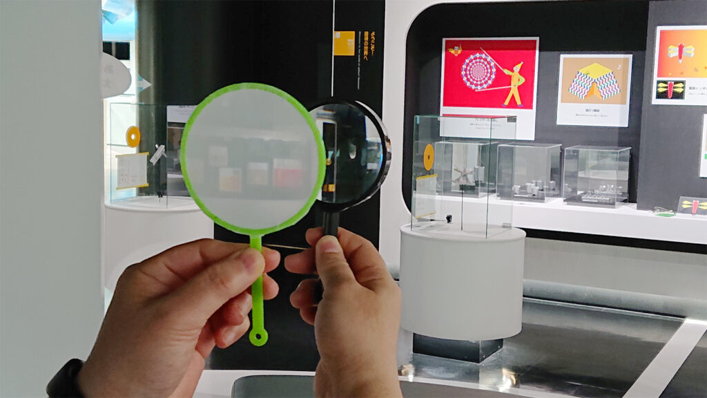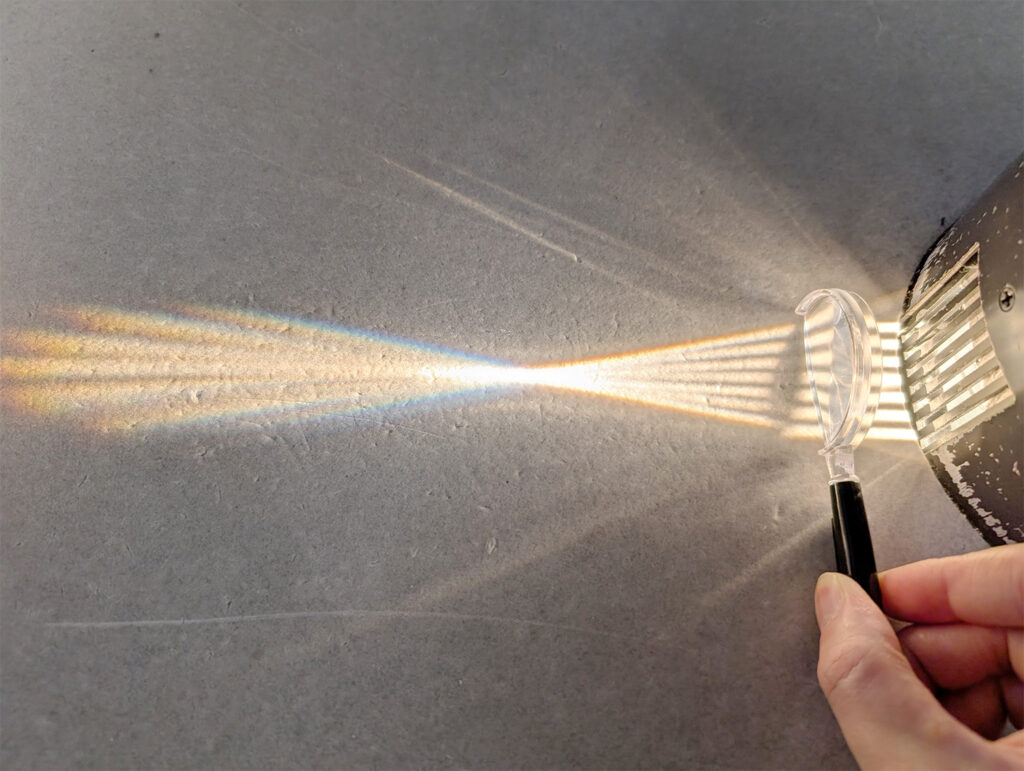 団体様は事前予約いただくことで、ご希望の展示物を使った科学実験・解説を体験いただけます。当館の光ゾーンには、光を曲げたり(屈折)、様々な色に分解したり(分光)できる「光のテーブル」という展示があります。この展示では、凹凸レンズやプリズムなどの実験アイテムを使い、光の曲がり方や見え方を観察することができます。