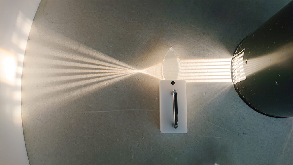 では、膨らんだ形をしたレンズを通った光は、どのように進むでしょうか。まっすぐな光に、膨らんだ形をしたレンズアイテムを置いてみましょう。すると、光が内側に曲がり、光が集まっていることがわかります。