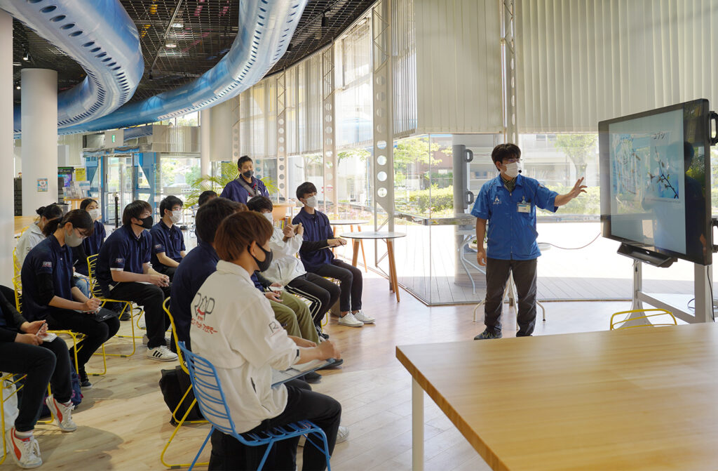 当館エントランス付近のカフェスペースにて、座学からスタートです。