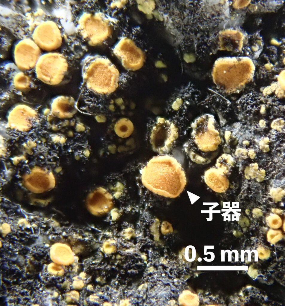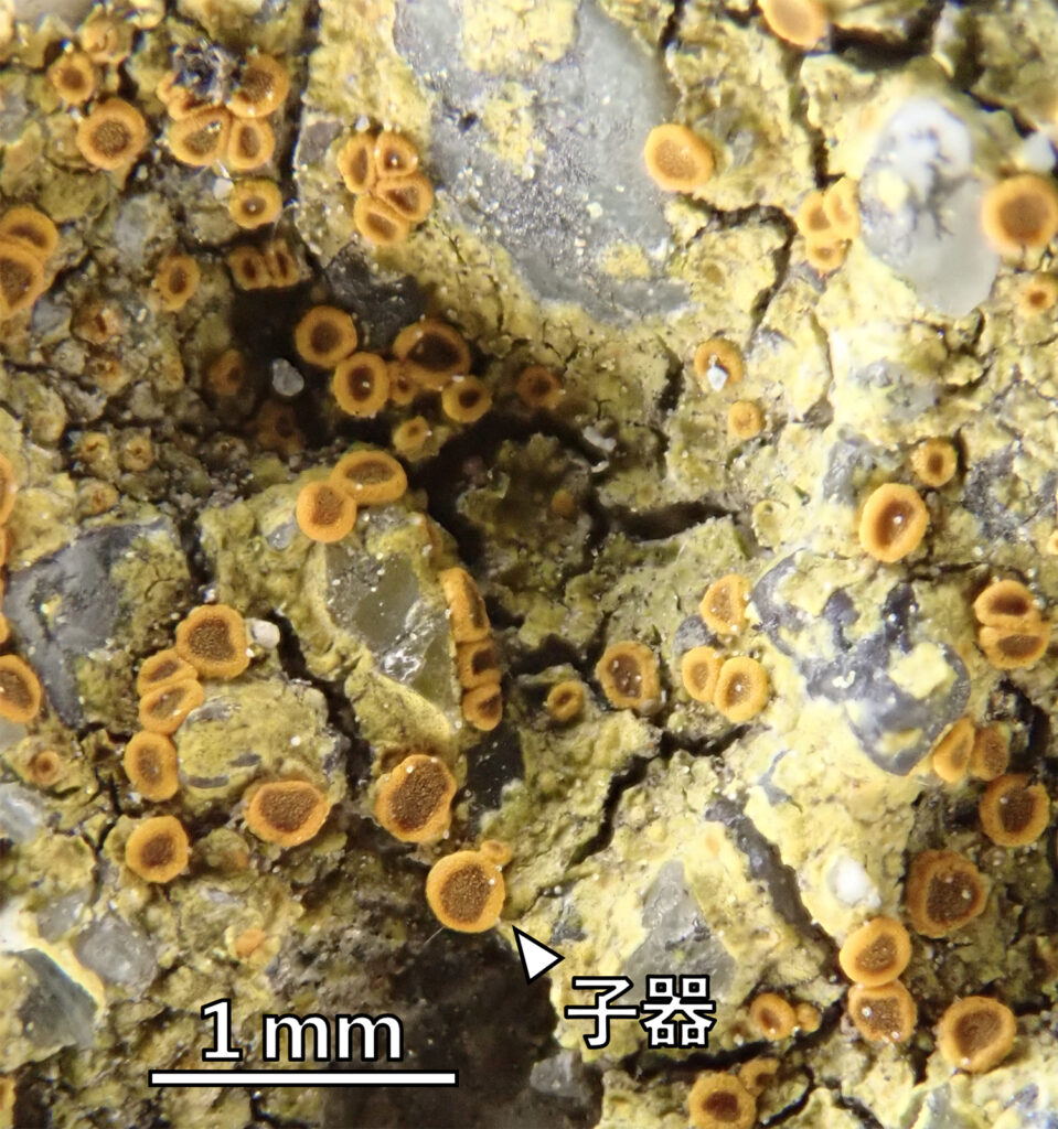 黄色のペンキを垂らしたような模様を拡大すると、やはりどら焼きのような子器がありました。しかし、先ほどのコウロコダイダイゴケのどら焼きよりも色が濃いです。こちらは「ツブダイダイゴケ」という別の種類の地衣類です。