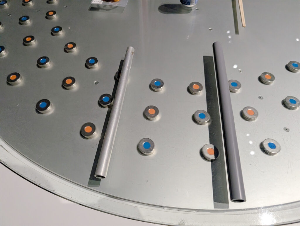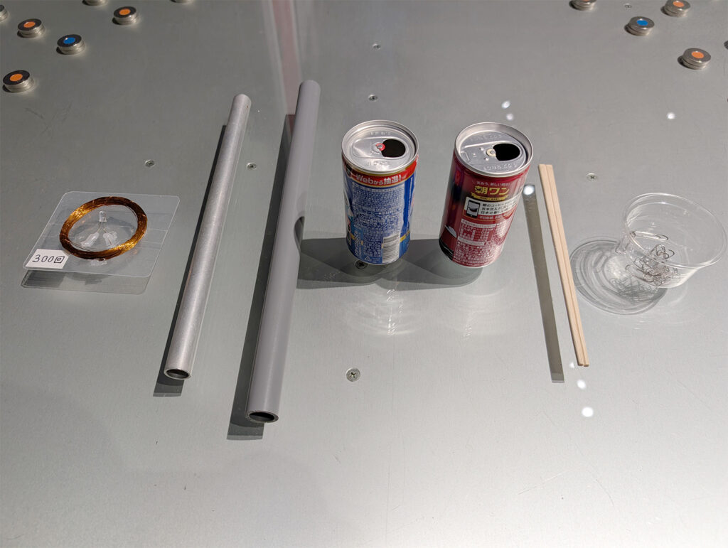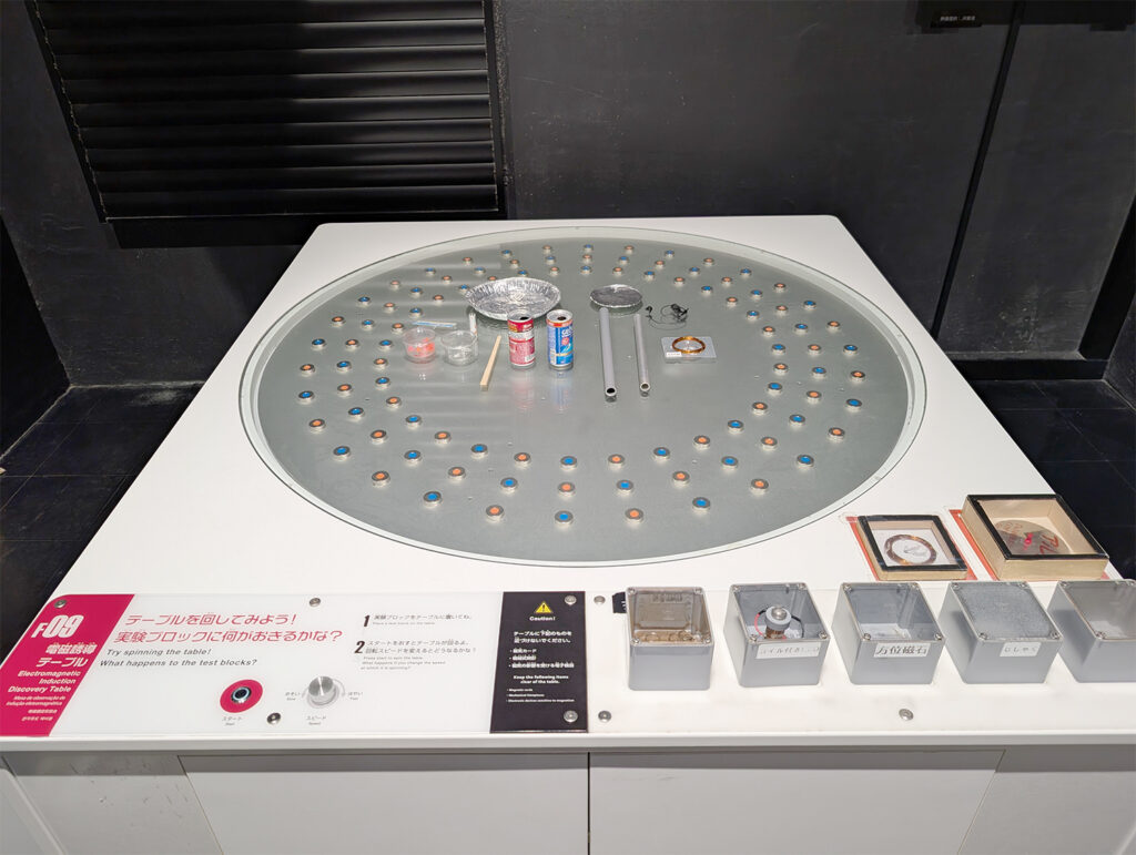 団体様は事前予約いただくことで、ご希望の展示物を使った科学実験・解説を体験いただけます。当館の力ゾーンには、磁石を埋め込んだテーブルが回転する「電磁誘導テーブル」という展示があります。この展示では、様々なものが入った箱をテーブルに置き、その変化を観察することができます。