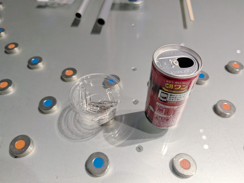 では。磁石が回転するテーブルの上にそれぞれのものを置いてみましょう。磁石にくっついたゼムクリップ、スチール缶は「ガタガタ」動きます。