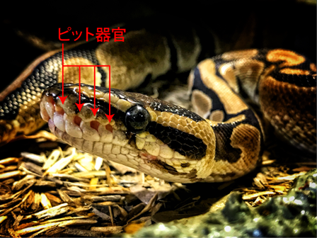 ニシキヘビ、マムシ、ハブの仲間は、赤外線を感知することができる「ピット器官」というセンサーを持っています。これらのヘビは、唇のあたりにいくつか穴が空いていて、そこで赤外線を感知しています。(図)しかも、ピット器官で得た赤外線の情報は、脳で目からの情報と重ねて処理されていることが分かっています。ヘビから見た世界は、熱を色で感知するサーモグラフィーのようになっているのかもしれませんね。