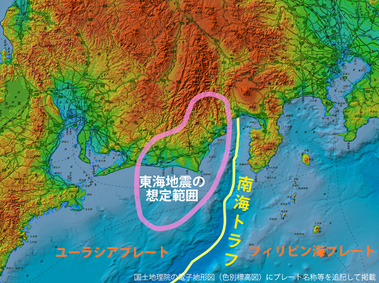 南海トラフ沿いの駿河湾から静岡県内陸部を想定震源域とするM8以上の地震を「東海地震」と呼んでいます。東海地震は、精度の高い観測、監視体制が整備されたこと等から、日本で唯一直前予知の可能性がある地震と言われています。