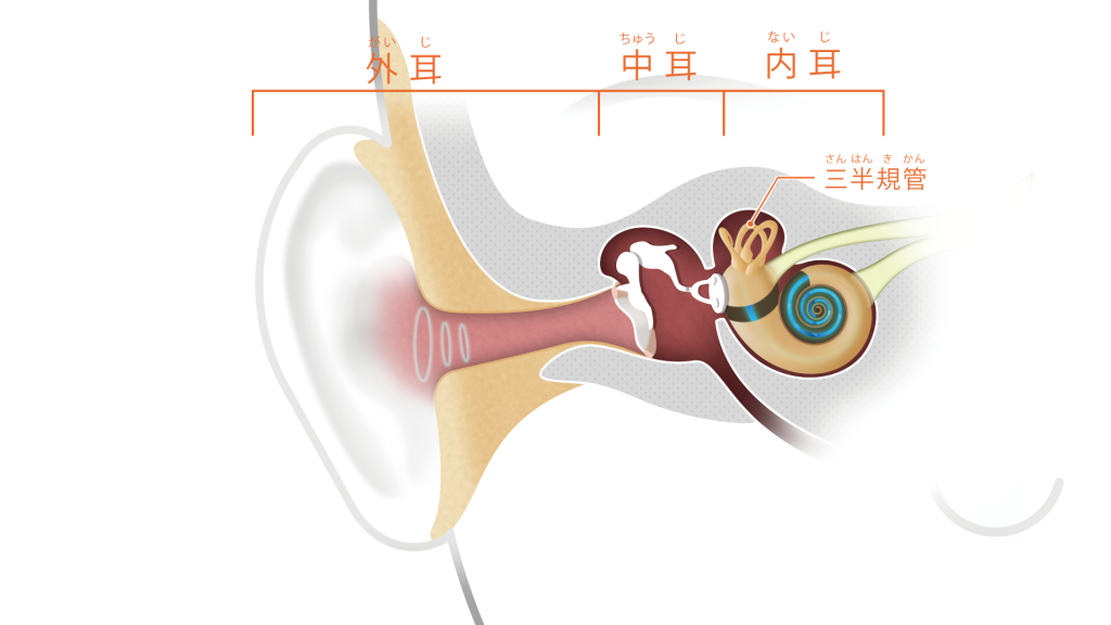 耳には、 音を聞くことのほかにも体のバランスを保つという大切な役割があります。耳の奥の「三半規管」の中にはリンパ液という液体が入っています。(図)体が動いたり、回転したりすると、このリンパ液が動くので体の位置や傾き、動きの方向などがわかります。これらの情報は、三半規管から神経を通って脳に送られます。脳はその情報によって、体のバランス感覚を保つことができるのです。