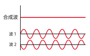 図2は、2つの波の山と谷の位置がずれていて、山と谷が重なる場合(波の位相が逆)、波は打ち消し合います。この原理は、ヘッドホンのノイズキャンセルや冷蔵庫などの家電製品の消音、工事現場の騒音対策など様々な場面で活用されています。