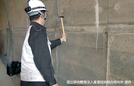 道路トンネルは2年から5年に1回は定期点検を実施することが国で定められています。その点検方法のひとつが「打音検査」です。検査員がハンマーでコンクリートの表面をたたき、キンキンという音(清音)か、ボコボコという音(濁音)かで良し悪しを判定します。良好な打音は高い周波数、不良な部位の打音は低い周波数で、かつ音の波形に揺らぎが出ます。音の微妙な違いによって、内部のひび割れや腐食など危険箇所を見つけます。(図)