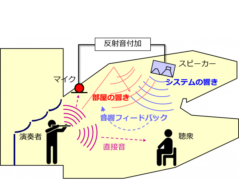 この部屋には、マイクとスピーカーが複数配置されています。マイクで集音した音に信号処理によって反射音を合成してスピーカーから再生しています。再生音に部屋の響きが加わり再びマイクで集音することで音響的ループが生じます。(図)これらの反射音やループを制御することで、3つの響きを実現しています。