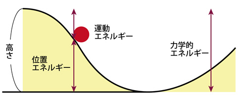 高い位置にある物体がもっているエネルギーを「位置エネルギー」、運動している物体がもっているエネルギーを「運動エネルギー」といいます。位置エネルギーと運動エネルギーは互いに変換されますが、その合計である「力学的エネルギー」は一定です。これを「力学的エネルギーの保存の法則」といいます。(図2)