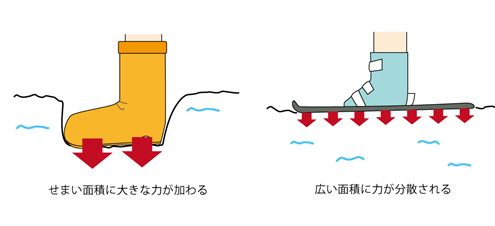単位面積あたりのものの表面に垂直にかかる力を「圧力」といいます。雪の上を長靴で歩くと長靴がしずみますが、スキーをはくとあまり雪にしずみません。同じ体重でもスキーをはいたときは、スキーの板と雪がふれあう面積が大きくなり、雪にかかる力が分散されて圧力が小さくなるからです。(図1)