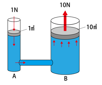 図2では、ピストンAに加えた力は、面積比が10倍の力となってピストンBに加えられます。パスカルの原理を使うと、小さな力を大きな力に変えることができます。