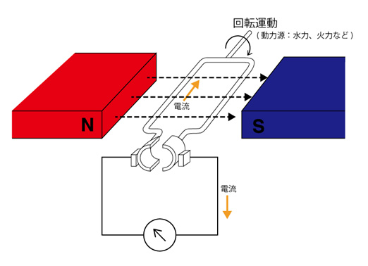磁界の中で導線を動かすと、導線の中に電圧が生まれて電流が流れます。この現象を「電磁誘導」といいます。発電機とは、磁界の中でコイルを回し、電磁誘導を起こして電気をつくる機械です。(図)