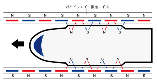 超電導リニアは、超電導磁石を取り付けた車両が「ガイドウェイ」を走ります。車両が浮上して前に進むのは、ガイドウェイの「推進コイル」と「浮上・案内コイル」によるものです。推進コイルに電気を流すとコイルが磁石になり、車両に取り付けた磁石との間に引き合う力と反発する力を発生させ、連続的に繰り返すことで前進させています。 (図)「浮上・案内コイル」 は、車両を浮かせ、ガイドウェイの中央に車両を案内する役割を担っています。