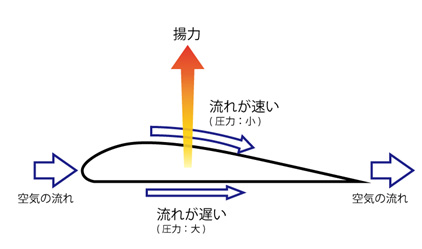 飛行機の揚力(翼を上向きに引き上げる力)は、飛行機の翼の断面の形によって生まれます。飛行機の翼は、上面が丸くなり下面よりもふくらんだ形をしています。空気の流れは翼の上の方が速くなり、圧力は小さくなります。この上下の圧力差で、翼は重力に逆らって圧力の小さい上の方へ引き寄せられ、飛行機を空に浮かべる大きな揚力となります。(図2)
