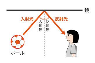 光は鏡にぶつかると、同じ角度ではね返ります。これを「反射」といいます。鏡などに映って見えるものを「像」といいます。(図1)