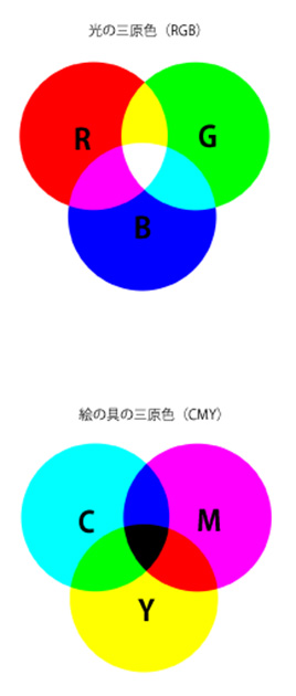 それぞれの色の頭文字を取って、光の三原色はRGB・絵の具の三原色はCMYと呼ばれます。(図)