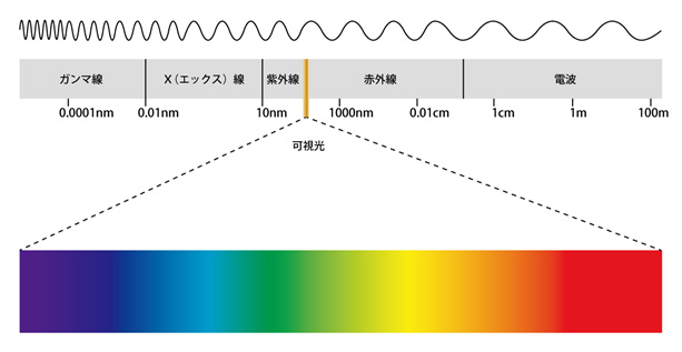 光は波としての性質を持つ電磁波の一種で、可視光線をはじめ赤外線、紫外線、X(エックス)線や電波などがあります。それぞれの波長によって性質が異なります。ガンマ線やX線のような波長が短い電磁波は大きなエネルギーをもちます。電波のような波長が長い電磁波はエネルギーが小さくなります。(図)
