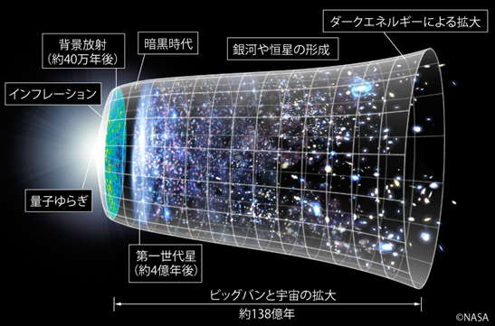 現在の宇宙論では、宇宙の始まりは約138億年前と言われています。宇宙は誕生直後の一瞬の間に急激な膨張をしたと考えられており、これを「インフレーション」と呼んでいます。その膨張によって解放された熱エネルギーにより、宇宙は超高温、高密度な状態となりました。これが、いわゆる「ビッグバン」です。以降、物質のもととなる素粒子ができ、陽子や中性子が生まれて原子核が形成されました。宇宙で最初の原子核ができたのは、宇宙が誕生してはじめの3分間の出来事だといわれています。