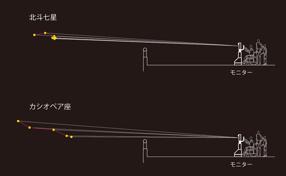 北斗七星はひしゃくの形、カシオペア座はWの形に見えますが、実は、宇宙空間では星々はそのような形に整列しているわけではありません。宇宙空間に三次元的に並んでいる星々が、地球から見たときだけそのような並び方に見えるのです。カシオペア座のWを形作る星のうち、最も近いものは約45光年、最も遠いものは約650光年も離れています。もしも地球がある銀河系を離れて、宇宙空間の全く違う場所から星座を観測できたら、全然違う形に見えるかもしれませんね。(図)